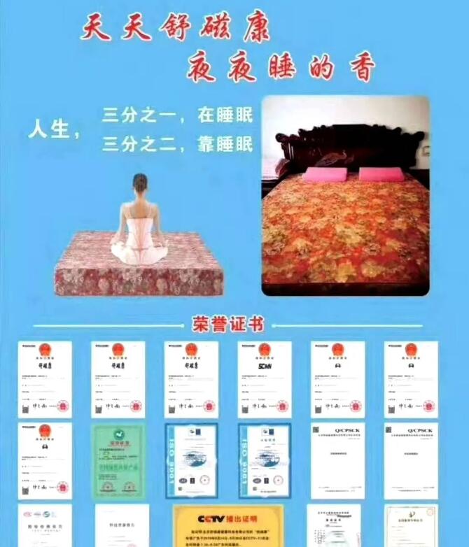 它的面料考究,提花刺繡,上面有舒磁康標(biāo)識(shí)。就象我們穿的毛衣,如果是化纖的,在脫的時(shí)候,是不是會(huì)有靜電,靜電偷走了我們的負(fù)電荷,使紅細(xì)胞聚集,對(duì)我們的健康危害很大。而舒磁康地磁床墊,一是防靜電,再一個(gè)圖案非常漂亮,所有人都喜歡牡丹花,它的立體感和層次感都非常強(qiáng)。有直觀的防偽作用。